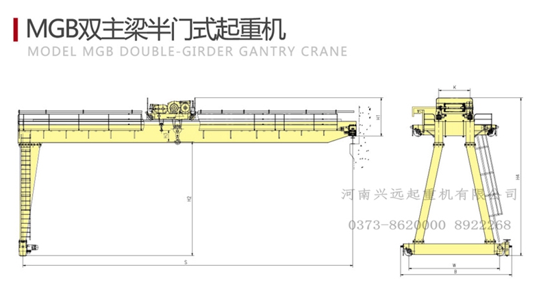 MGB型雙梁半門式起重機,雙梁半龍(lóng)門,箱(xiāng)型龍門吊;MGB型雙梁半門式(shì)起重機是一種有軌運行的中大型起重(chóng)機,其起重量為10t~50t。跨度為(wéi)18~35m,工作環境溫度為-25℃~40℃。